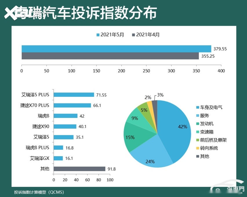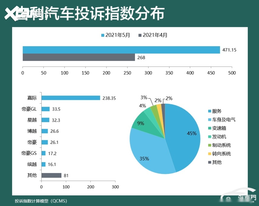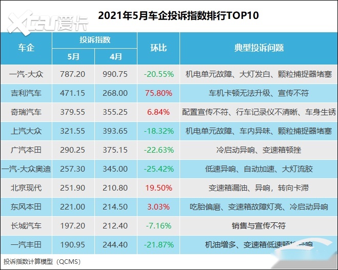 2021年5月车企投诉指数显示,一汽-大众冲高回落环比下滑22.55%,探岳)依旧是一汽-大众投诉的支柱车型,大灯透镜发白、颗粒捕捉器堵塞愈演愈烈;吉利汽车嘉际)车机卡顿死机没办法升级集中投诉升至第二位,车机问题已陆续出现在吉利多款车型上;奇瑞汽车捷途X70) PLUS宣传与实际发布声明后效果并不理想,捷途X90)同样被爆出宣传与实际不符。