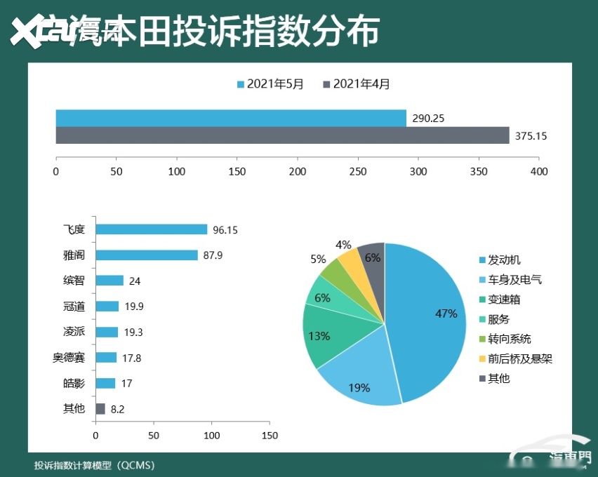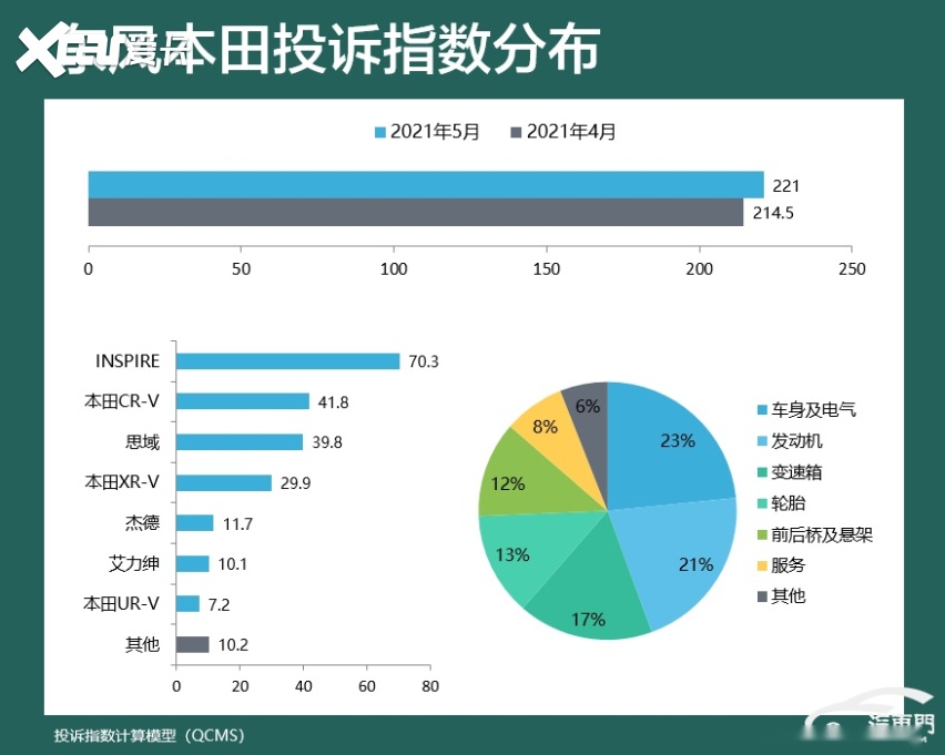 汽车质量投诉点评:本月东风本田投诉指数变化不大,排名也与上月持平,投诉集中在INSPIRE)、本田CR-V)、思域)和本田XR-V)四款车型上,投诉问题设计车身及电气、发动机、变速箱各个层面;其中吃胎偏磨问题INSPIRE、本田CR-V、思域均有涉及,本田XR-V则冷车启动异响问题明显,此外变速箱故障灯亮在INSPIRE上投诉较多。