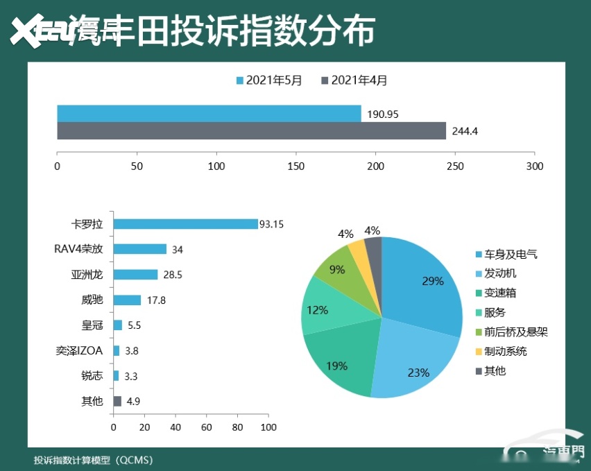 汽车质量投诉点评:一汽丰田投诉指数环比下滑21.87%,排名降至第十位,投诉问题复杂多样,车身及电气、发动机、变速箱、服务等均有较大份额,但投诉车型却相对单一,卡罗拉)投诉指数占比高达48%,变速箱低速行驶顿挫异响遭遇车主集中投诉;机油增多乳化问题虽已过去两年,但在RAV4荣放)上依旧存在。