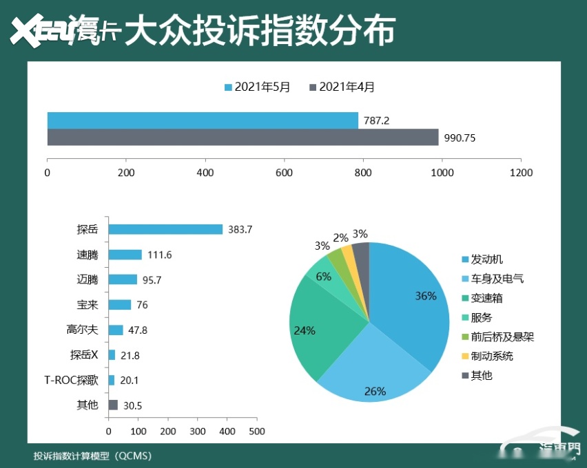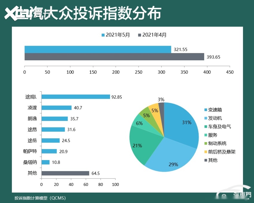 汽车质量投诉点评:本月上汽大众投诉指数环比下滑18.32%,排名第四;投诉问题集中于发动机、变速箱、车身及电气三大层面,分别占比29%、31%、21%,其中发动机问题主要体现为途观L)颗粒捕捉器堵塞,该问题在探岳上同样严重;变速箱问题主要体现为机电单元故障,以帕萨特)、凌渡为主;车身及电气问题各车型均有涉及。
