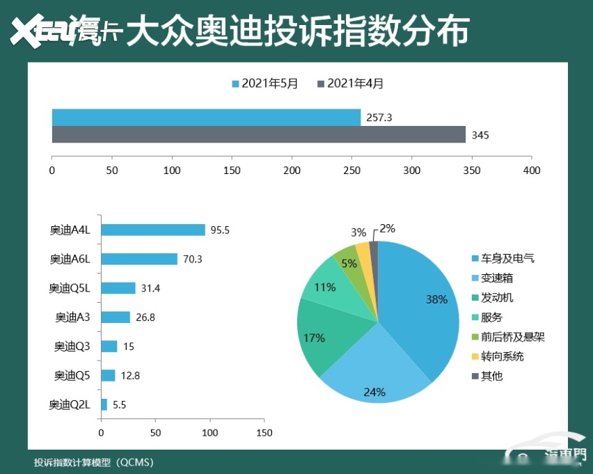 汽车质量投诉点评:本月一汽-大众奥迪投诉指数环比下滑25.42%,投诉车型集中于奥迪A4L)、奥迪A6L)、奥迪Q5L),以车身及电气、变速箱、发动机问题为主,主要体现为大灯内部流胶、变速箱顿挫、低速自动加速、节温器故障。