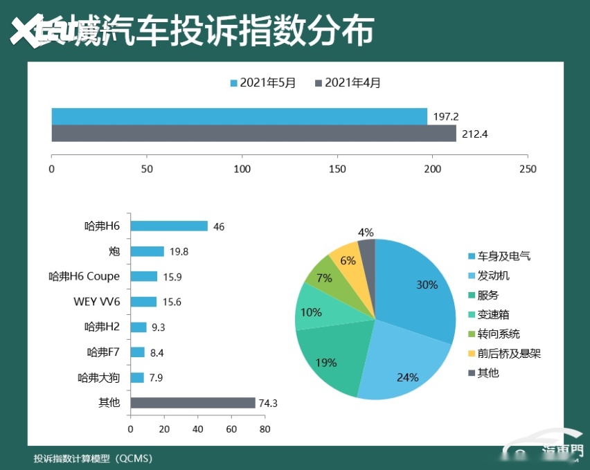 汽车质量投诉点评:长城汽车本月排名不变,投诉指数环比下滑7.16%,旗下多个品牌以哈弗投诉为主,其中哈弗H6)因车载5G功能模糊宣传误导消费者引发小规模投诉,此外随着销量增长长城皮卡的投诉量也有所升高,长城炮)以19.8的投诉指数位列投诉车型第二位,投诉以发动机问题为主。