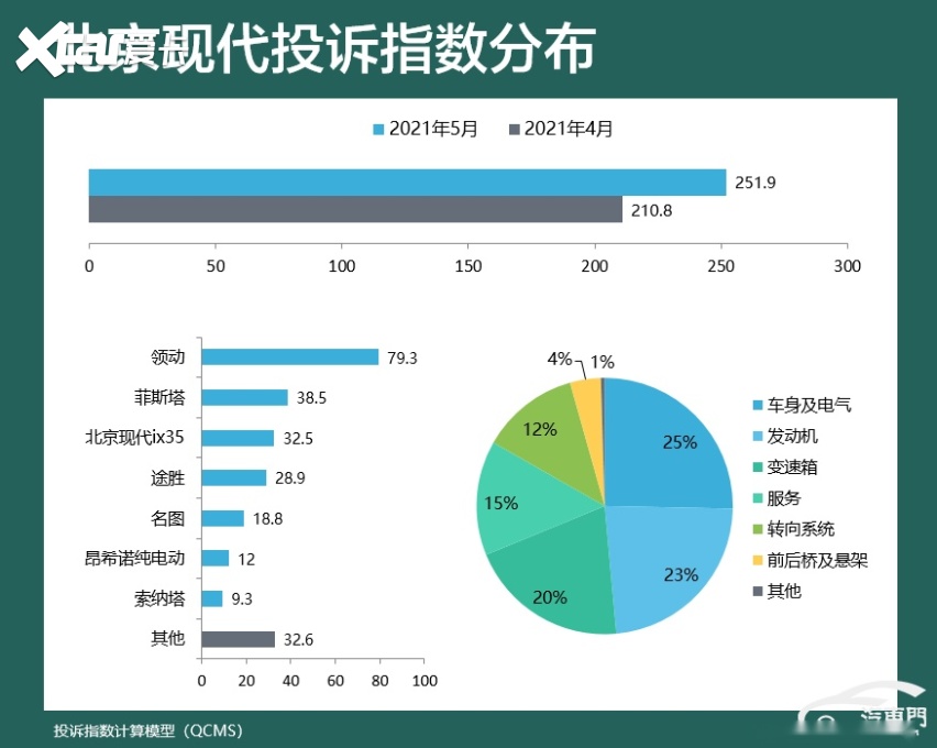 汽车质量投诉点评:北京现代投诉指数环比增长19.5%,升至第七名,投诉问题分布十分均衡,车身及电气、发动机、变速箱等投诉占比均在20%左右;投诉车型除领动)相对突出外,其他车型的差距并不大,领动投诉问题主要体现为转向卡滞、烧机油、变速箱顿挫异响,昂希诺纯电动虽然投诉量并不多,但仅有的几条投诉均集中在变速器与电机结合处漏油问题上,需引起重视。